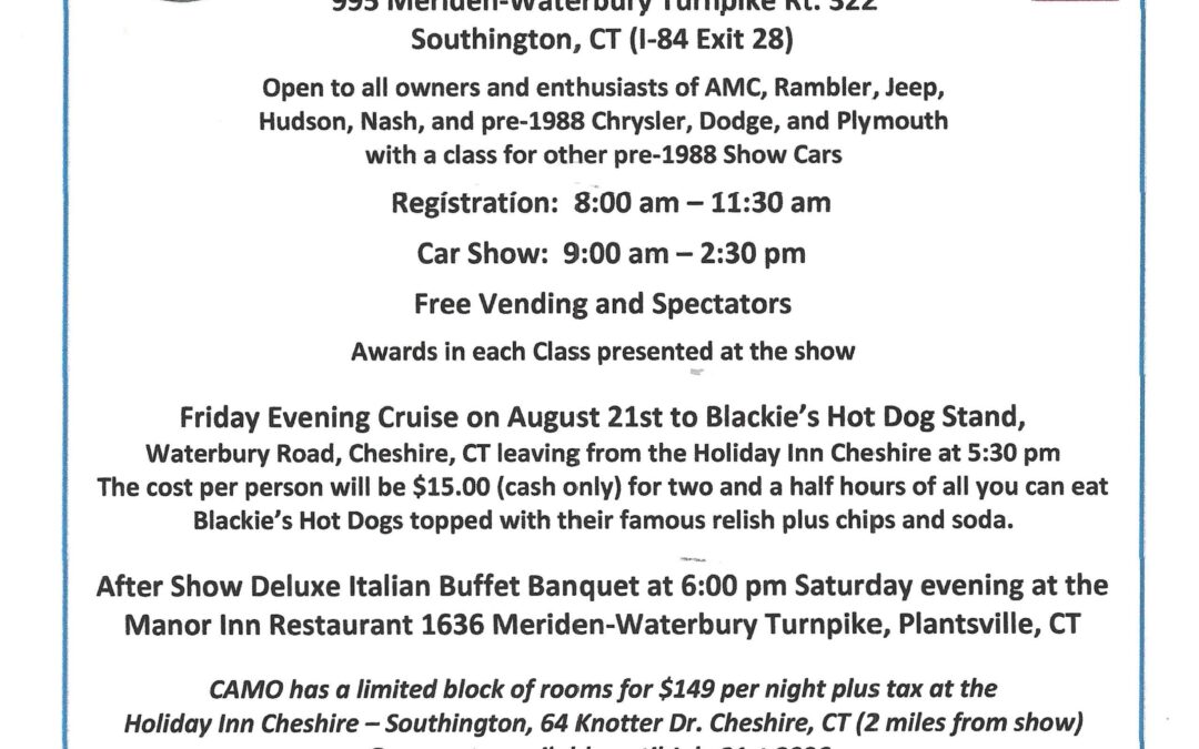 Friday, August 21, 2026 – Evening Cruise to Blackie’s Hot Dog Stand, Waterbury Road, Cheshire – leaves Holiday Inn Cheshire at 5:30 pm. Cost is $15.00 each (cash only) for two and a half hours of all you can eat Blackie’s hot dogs topped with their famous relish plus chips and soda.
